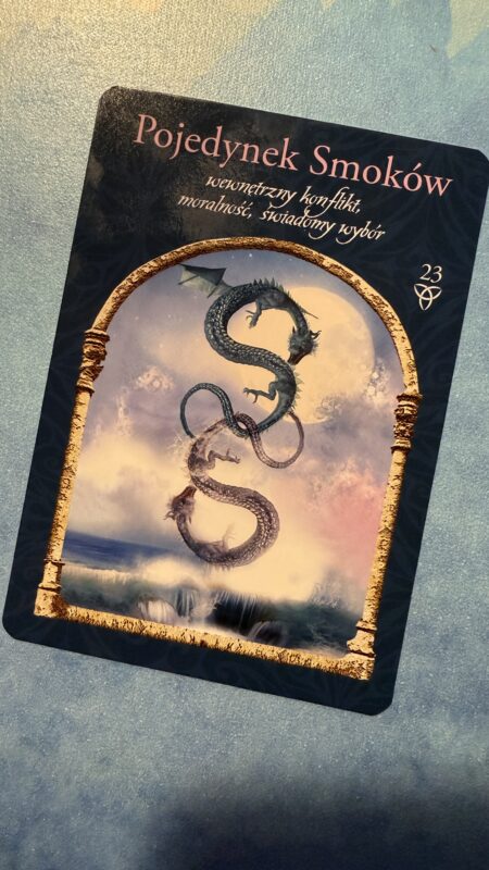 Ta karta to moment prawdy. Nie przed światem… przed sobą. Masz w sobie dwa głosy – jeden ciągnie w stronę lęku, drugi w stronę odwagi. Jeden mówi: „zostań w tym, co znane”, drugi: „idź po swoje”. Pojedynek Smoków to starcie wartości, ego i duszy. I nie chodzi o to, żeby wszystko wiedzieć. Chodzi o to, którego smoka nakarmisz.
