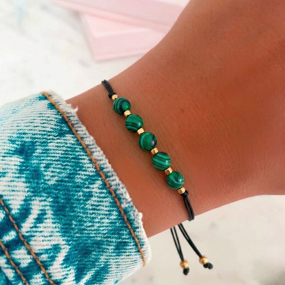 MOC BRANSOLETKI: Wyciąganie blokad energetycznych i odwaga do zmiany. Ten kamień daje potężne wsparcie dla Twojego pola energetycznego, kiedy jesteś zablokowana i boisz się zrobić krok naprzód. Malachit daje Ci moc do wyciągnięcia na wierzch Twoich najgłębszych blokad i daje energetyczne zaplecze, żeby mieć odwagę przejść diametralną zmianę.